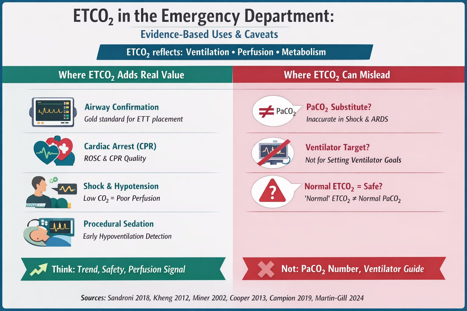 This post summarizes where ETCO₂ adds strong, evidence-based value in the ED, where it should be interpreted cautiously, and where it should not be used as a surrogate for arterial CO₂.