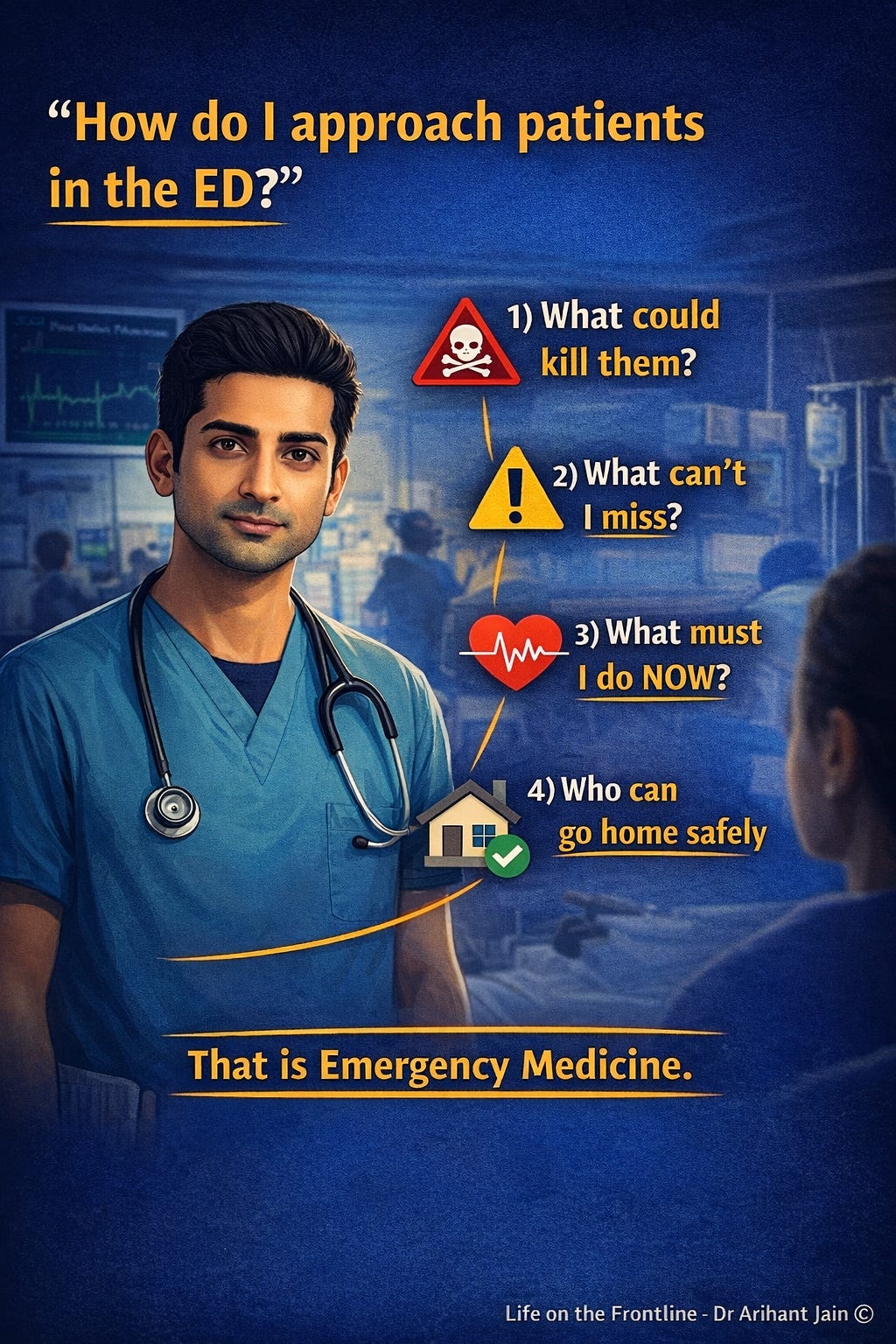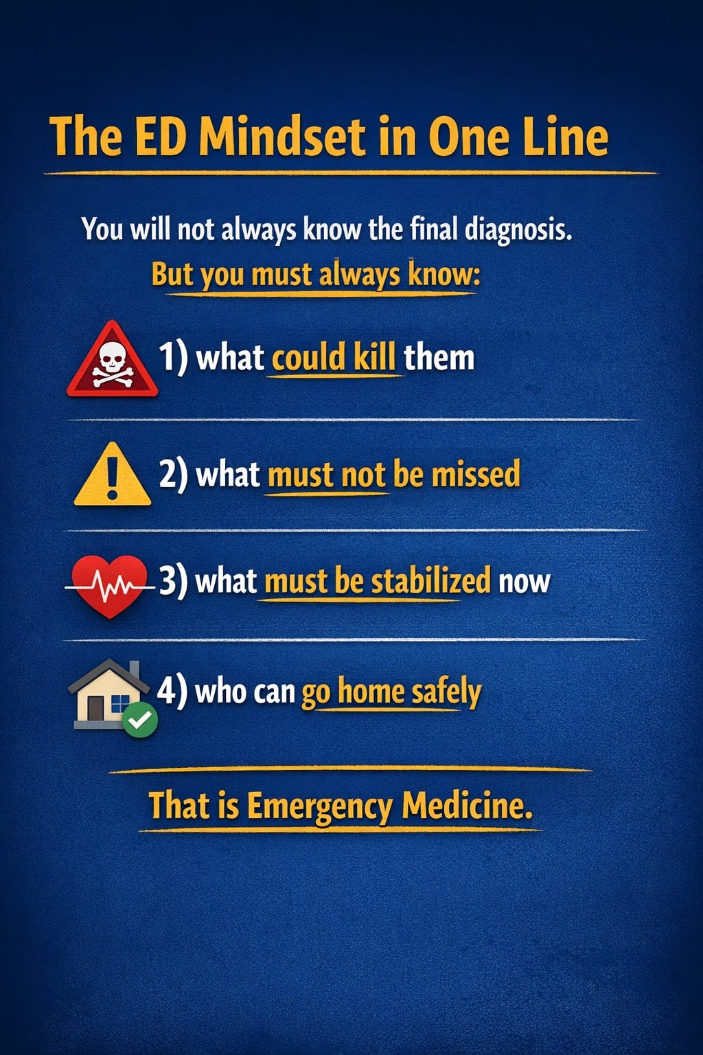 Emergency medicine is pattern-based + risk-based.