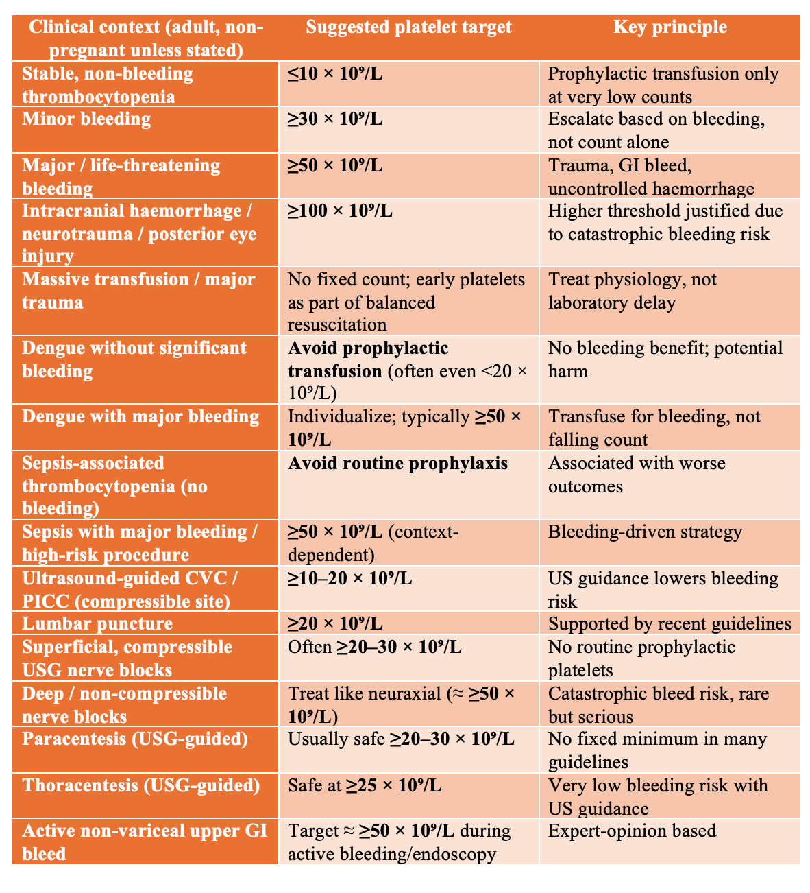 Major or life-threatening bleeding : target ≥50 × 10⁹/L